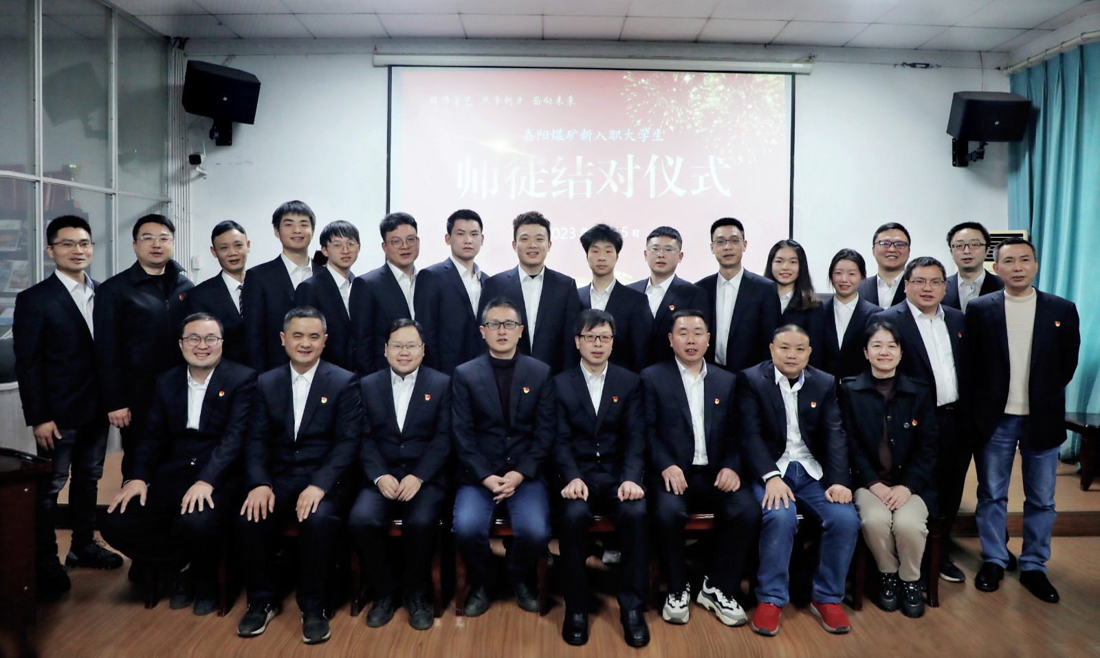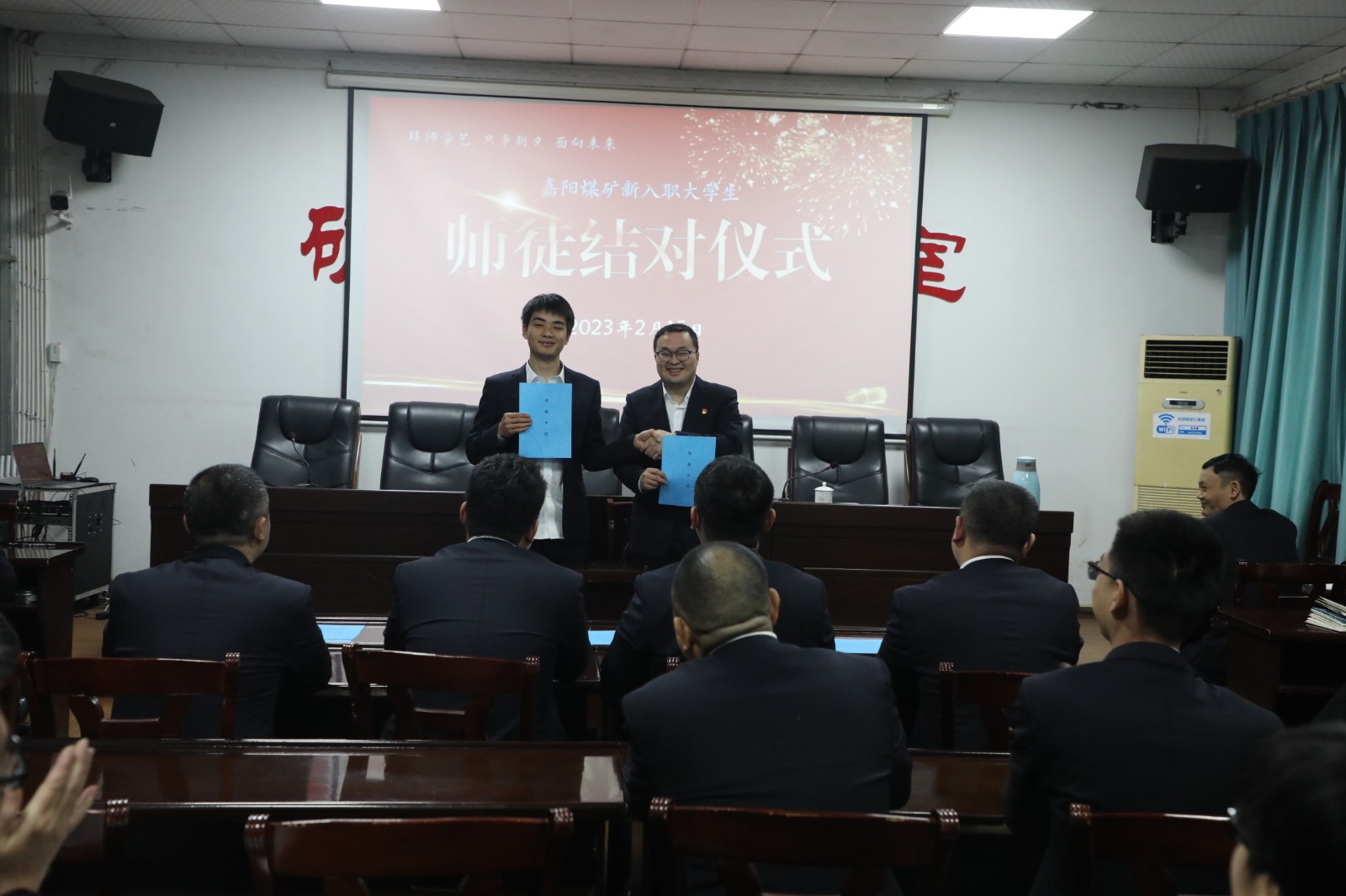胜游(中国)职工培训学校校长程敏、嘉阳煤矿矿办领导参加了师徒结对仪式。
