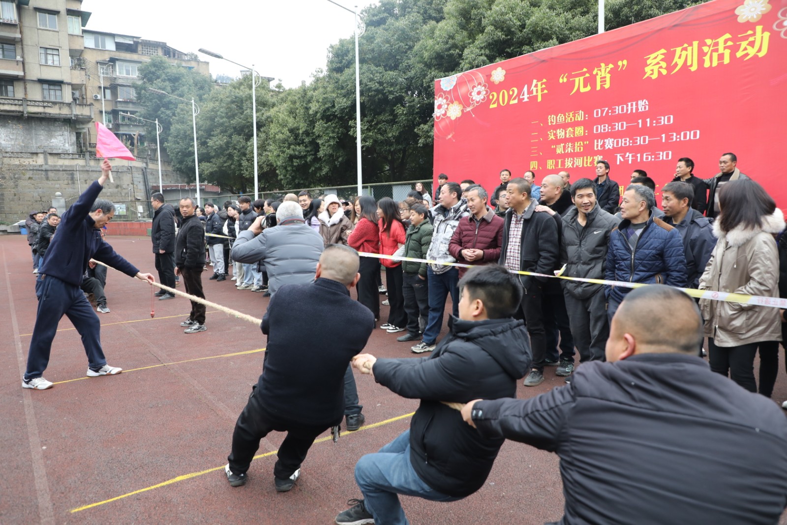 活动伊始,拔河赛在热烈的欢呼声中拉开序幕,18支男子代表队和6支女子代表队展开了紧张而激烈的角逐,展现出坚韧不拔的精神风貌,观众们为参赛选手加油鼓劲,助威声、呐喊声此起彼伏。
