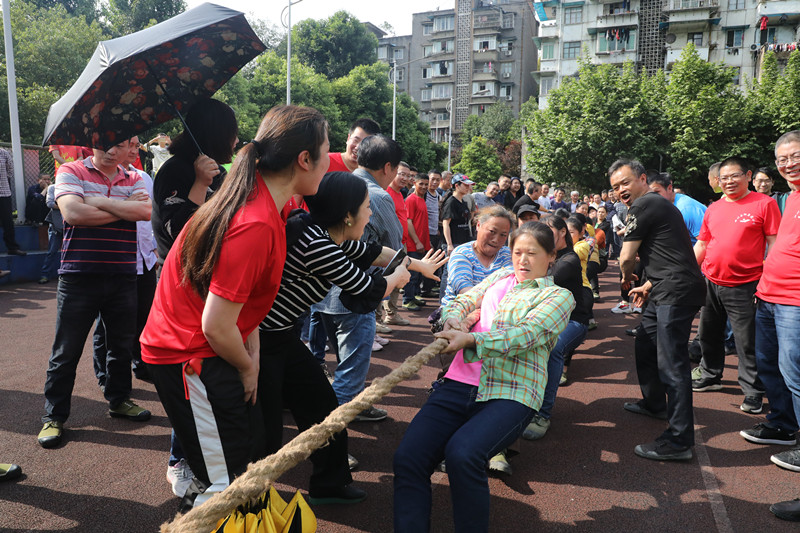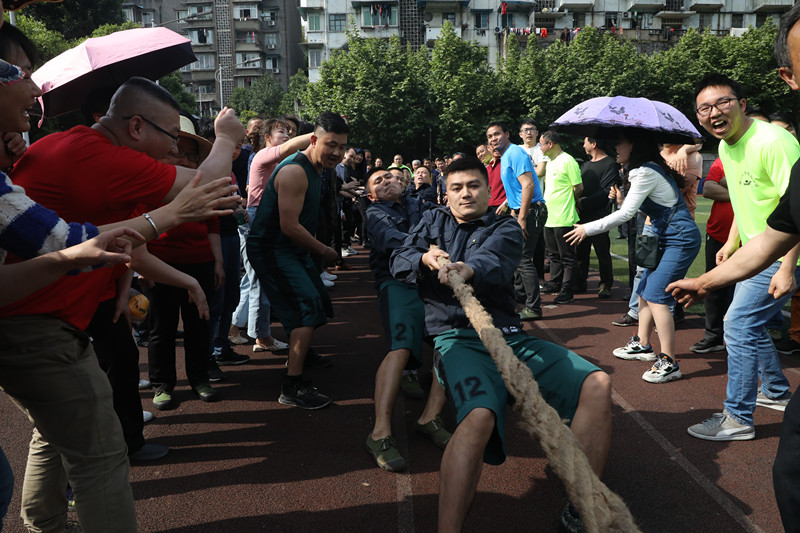 现场队员们的热情跟头顶的太阳一样火热。比赛采用三局两胜制,一局定胜负,4支女队和18支男队,两两对抗一较高下。比赛率先在女队之间展开,机关供司联队对川投峨旅代表队,综合服务公司对嘉阳煤矿代表队。裁判员一声哨响,比赛开始,一旁的男队员也站在两边为各自的女队员加油助威。别看女队员们个个温文柔弱,可一但冲锋上阵那也是力量满满、霸气十足。相对来说,男子组的比赛那才真正是力量的比拼,也更加精彩,尤其是势均力敌的两队在胜负难分的时刻,大家毫不退却、咬紧牙关,坚持不懈,现场加油助威声也是一浪高过一浪。输赢一笑两欢,我想最后的结果并不重要,大家能劲往一处使,一起收获快乐、分享喜悦这才应该是拔河比赛真正受到职工们喜欢的原因吧。