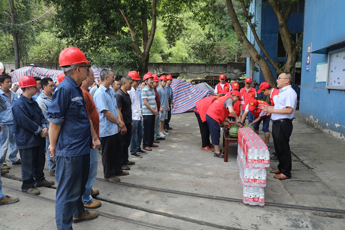 7月20日下午,机关第一党支部和机关一分会党员职工代表前往矿山机电制造维修分公司,向奋战在高温一线的职工送去西瓜、矿泉水,表达组织的关心、关爱,并检查防暑降温工作落实情况。