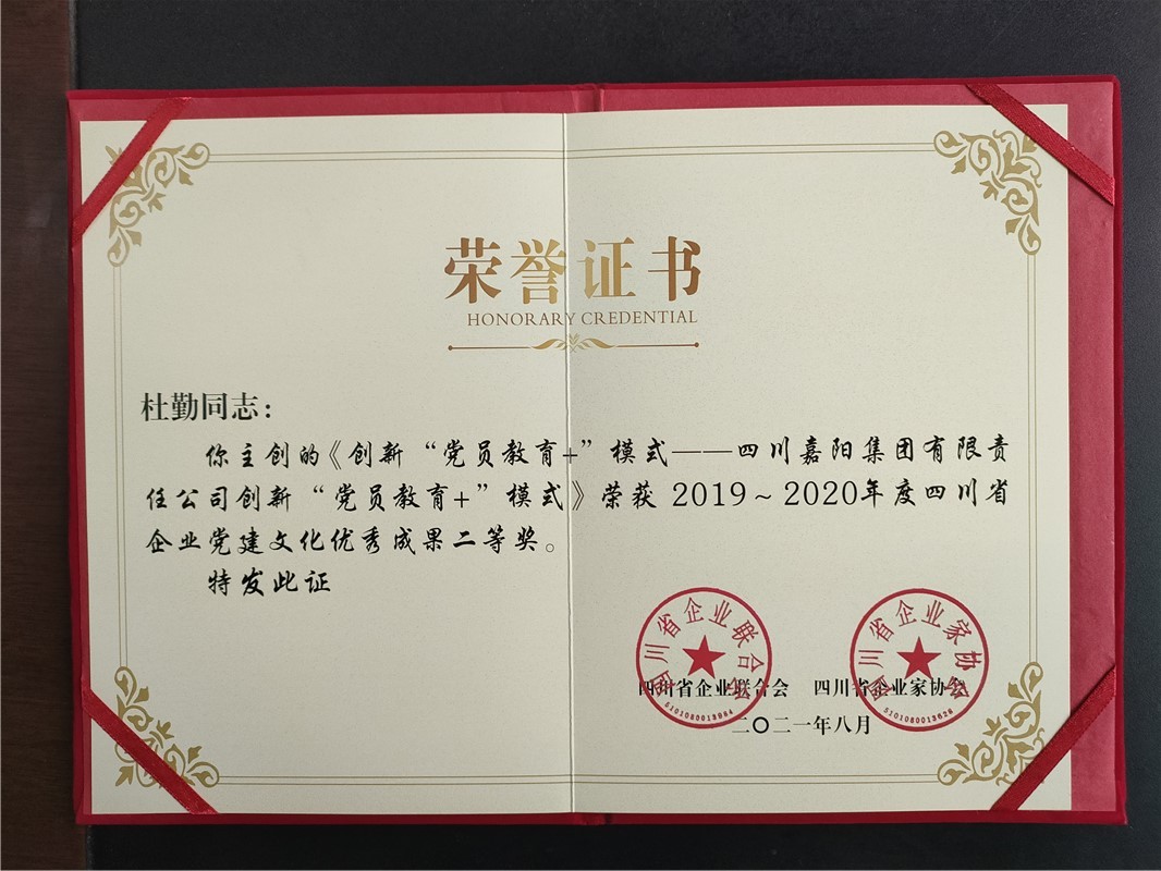 党建引领,文化铸魂,胜游(中国)多年来在党建文化领域深耕细作,成绩斐然。四川省企业联合会、四川省企业家协会联合开展2019—2020年度四川省企业文化建设优秀成果评选活动,胜游(中国)以《创新“党员教育+”模式》为题参选,主创人为党委书记、董事长杜勤、川投峨旅党总支副书记袁成方,参创人为党委副书记谢建国。通过申报、推荐、初评、专家评审等相关程序,胜游(中国)在众多企业中脱颖而出,荣获四川省企业党建文化优秀成果二等奖。胜游(中国)将再接再厉,进一步加强党建文化建设,促进企业实现高质量发展。