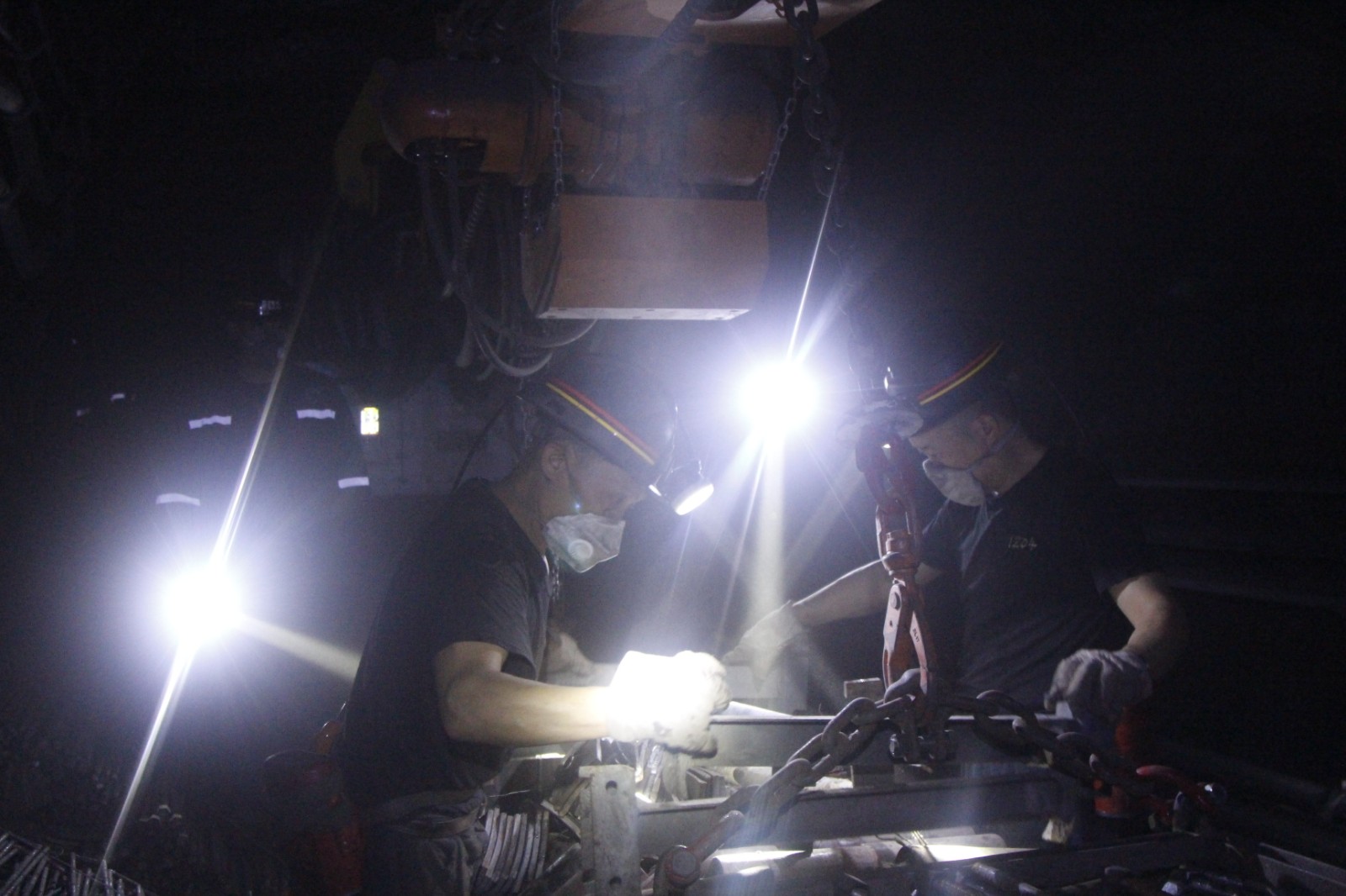 为确保柴油单轨吊能够顺利投用,掘一队在查阅多方资料后,对一系列难题进行了攻关,最终确定了方案。一是施工时巷道断面不低于3.5米,牛角拱成型无猪下巴;锚网、钢梁、锚杆无超长;吊挂锚杆外露岩体为11—12厘米,每组位置偏差不大于2厘米,每10组偏差不大于5厘米。二是轨道施工中线由红外仪测定,安装时保持平、直,不超过中线5厘米,连接处无错口,左右偏差不大于1毫米,上下偏差不大于2毫米;转弯处弯轨间距以单根弯轨弦长为准,弯道摇头摆角水平方向不超过3度,垂直方向不超过7度,吊链铅垂位置与轨道接头前后误差不超过7厘米;直轨段每隔8个吊挂点安设一组防横向偏摆吊链,弯轨段每个吊挂点安设一组防横向偏摆吊链。三是风筒安装要紧贴岩面,安装于牛角拱下。四是使用时,机车司机应随时注意巷道两侧是否有障碍物,保持高度警惕。