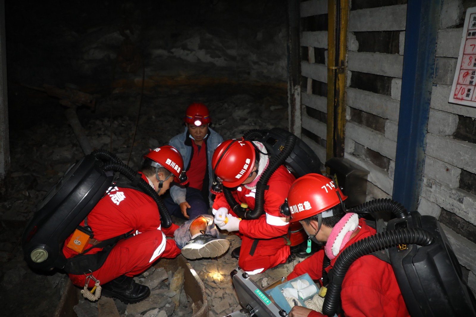 11日早上8点50分,嘉阳矿山救护队接到报警:黄村井因地震造成部分巷道垮塌,有遇险人员被困!值班员立即拉响警报,在不到一分钟的时间里,队员们迅速完成集结,携带装备火速赶往事故地点。9点15分,救援队伍到达事故地点后,一边向事故方了解矿井事故具体情况,一边进行入井前准备、搭建营地、成立临时指挥部。9点30分,救援队伍完成入井准备并携带装备入井侦察。在侦察中,救援人员对所经巷道进行气体浓度检测、现场安全检查;使用破拆工具、支护工具,清理垮塌区域;在发现受伤人员后,立即对伤员进行急救处理,将伤员搬运出地面。